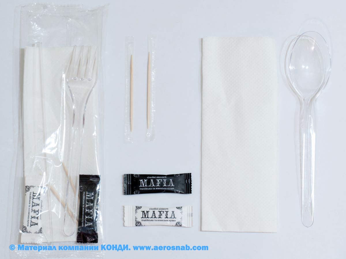 Ми пропонуємо оптом герметично запаковані одноразові набори зі столовими приборами — виделки, ложки, ножі, паперові и вологі серветки, зубочистки; порційні набори у стіках чи саше: сіль, цукор, перець, соуси и джеми. Набори можуть бути доповнені одноразовим посудом за бажанням.